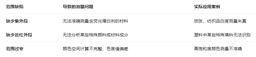 當儀器的波長范圍未能完全覆蓋樣品的關鍵光譜特征時,會出現測量偏差: