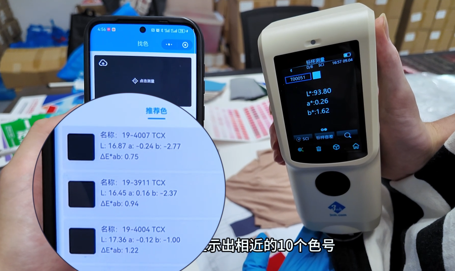 紡織品色號查找要求最高。需要匹配Pantone TCX(紡織棉版)色卡,容差標(biāo)準(zhǔn)ΔEab≤2.0。由于紡織品表面紋理影響,需要多次旋轉(zhuǎn)測量取平均值。匹配結(jié)果還需在不同光源下驗(yàn)證,確保D65、A、F11光源下ΔEab均達(dá)標(biāo)。